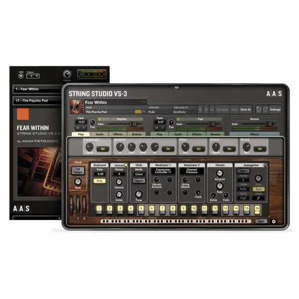 Fear Within was created with the String Studio VS-3 string oscillator synthesizer. You can obviously play and edit the sounds in String Studio VS-3, but you can also access and play them via the free AAS Player included with your Fear Within purchase.