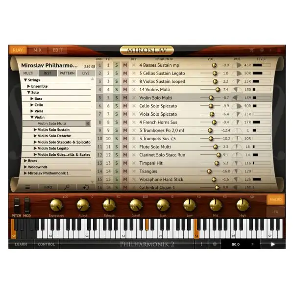 Miroslav Philharmonik 2 provides fantastic solo and ensemble string, brass, woodwind, keyboards, percussion and other instruments in stunning high-resolution sound. Its easy-to-use articulations and full spread of over 30 high-quality effects and many advanced features β derived from SampleTank 3 and T-RackS β provide unmatched sonic sculpting capability that makes it as great a choice for your next classical arrangement or film score as it is for your next hip-hop song or metal ballad.