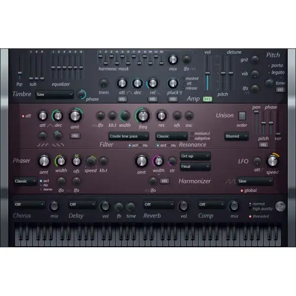 Simpler to program, yet packed with evil features. Under the hood, you will find unique options, like linking the phaser’s output to partials frequencies. The LFO section can act as a special modulation source, linking the phaser’s width to the velocity, or the pitch to the filter’s envelope.
