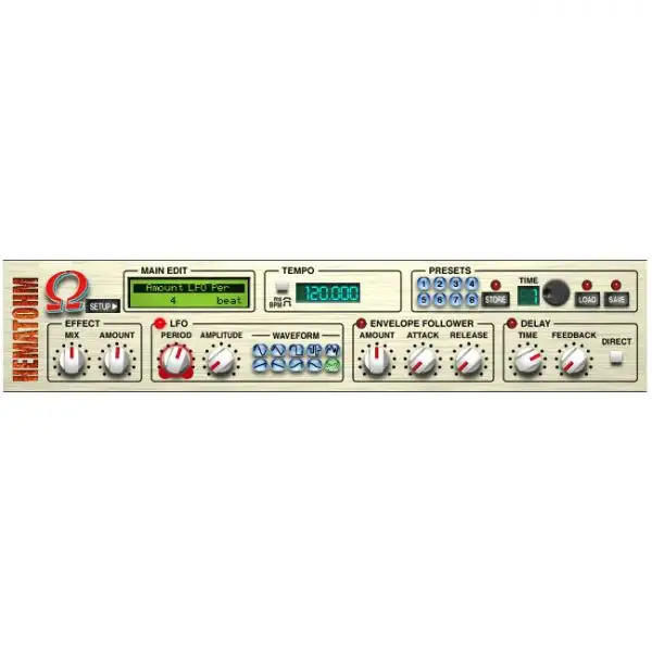 Combine Hematohm’s core competency with a vicious envelope follower to add some color, with an LFO with 10 waveforms and plenty of controls (like a 3 randomized shapes capable of an unlimited number of modulation patterns) and a delay that you can route to the direct forward path or the feedback path alone.