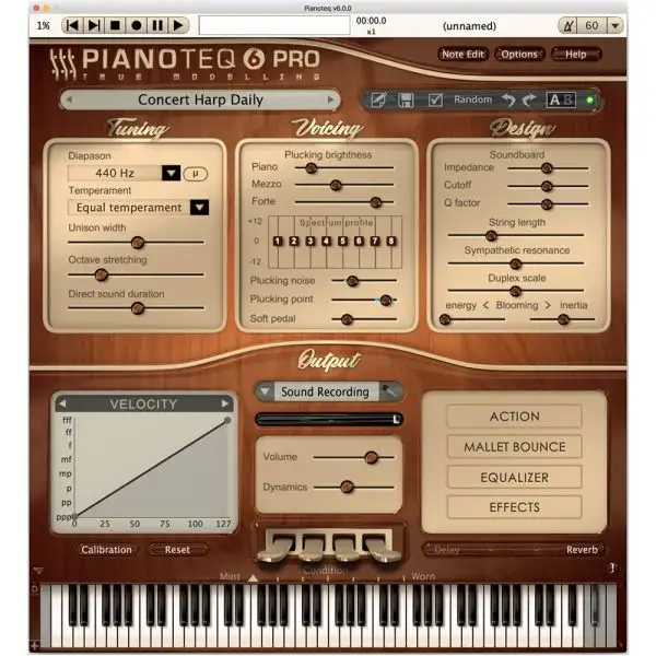 The Pianoteq Concert Harp is physically modeled after a Salvi concert grand harp. It allows to play pinch harmonics (flageolets) and glissandos. It includes a diatonic mode with seven pedals to change the pitch of the strings and play in all keys.