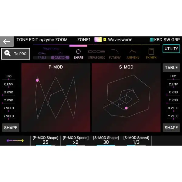 You can customize n/zymeβs oscillators by drawing your own waveform shapes right on FANTOMβs touchscreen. Render aggressive jagged waves for bold and edgy sounds, or soften things up by removing the rough edges with the smoothing function.